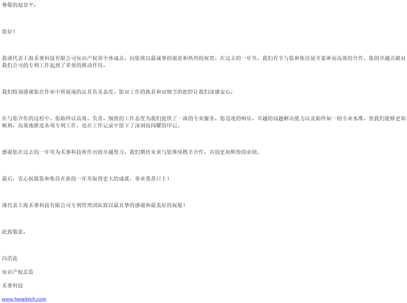 集佳优质服务赢得信任 客户禾赛科技致信感谢