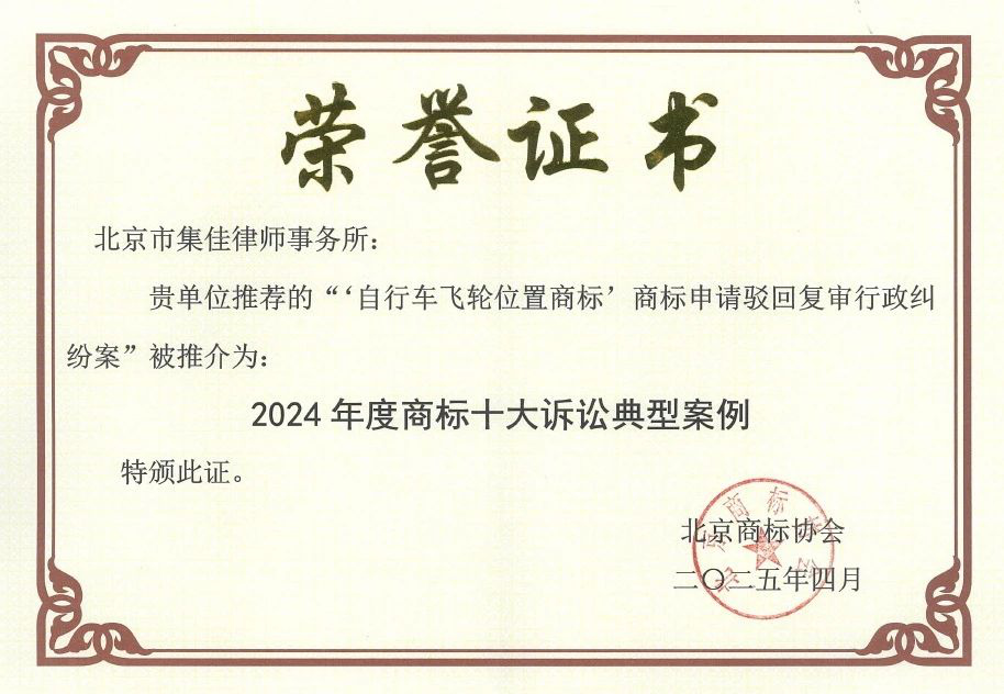 >米兰体育官网>关于我们>荣誉概览>2025>集佳代理“自行车飞轮位置商标”行政纠纷案入选北京商标协会年度十大诉讼典型案例